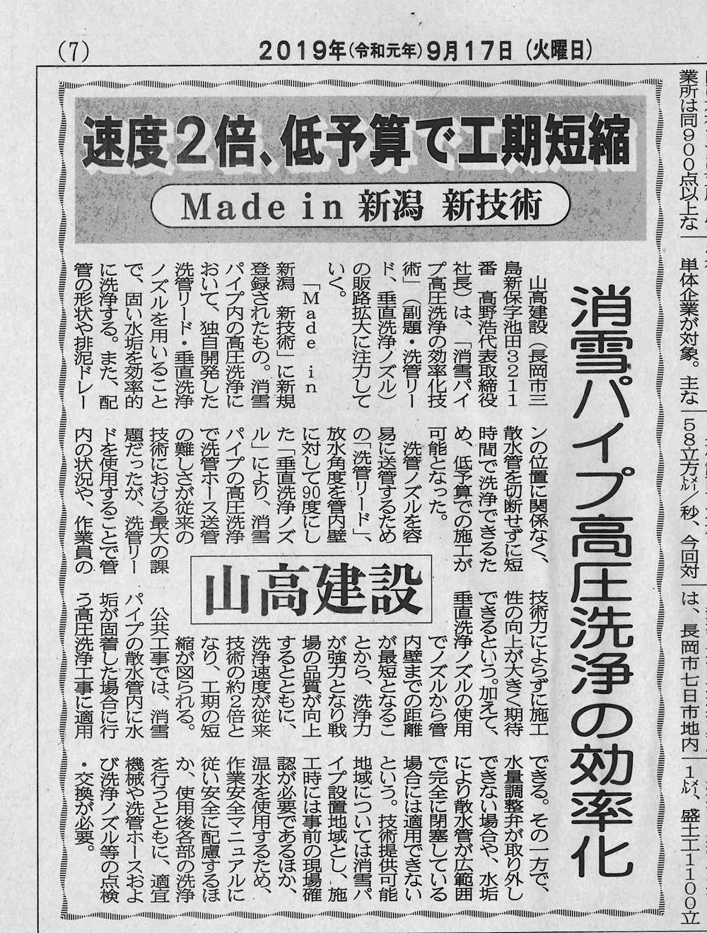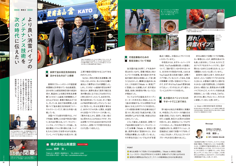 | 令和元年8月 | Made in 新潟に「消雪パイプ高圧洗浄の効率化技術」が認定登録 |