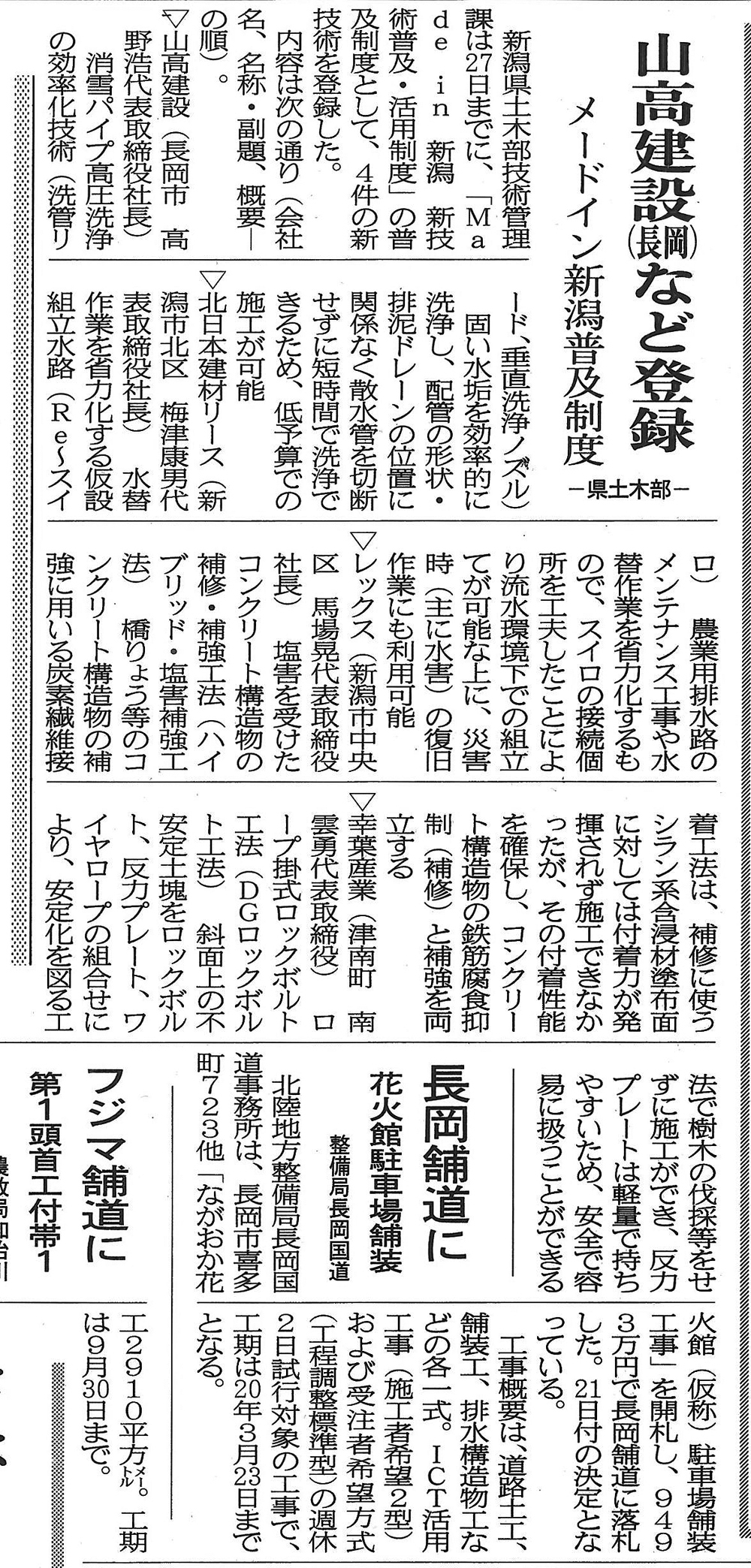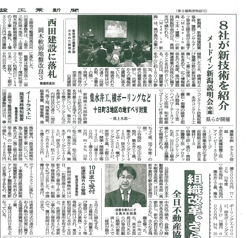 | 平成31年1月 | 平成30年度新潟県建設業新分野進出優良事業として表彰 (※新潟日報・建設工業新聞に掲載↓) |