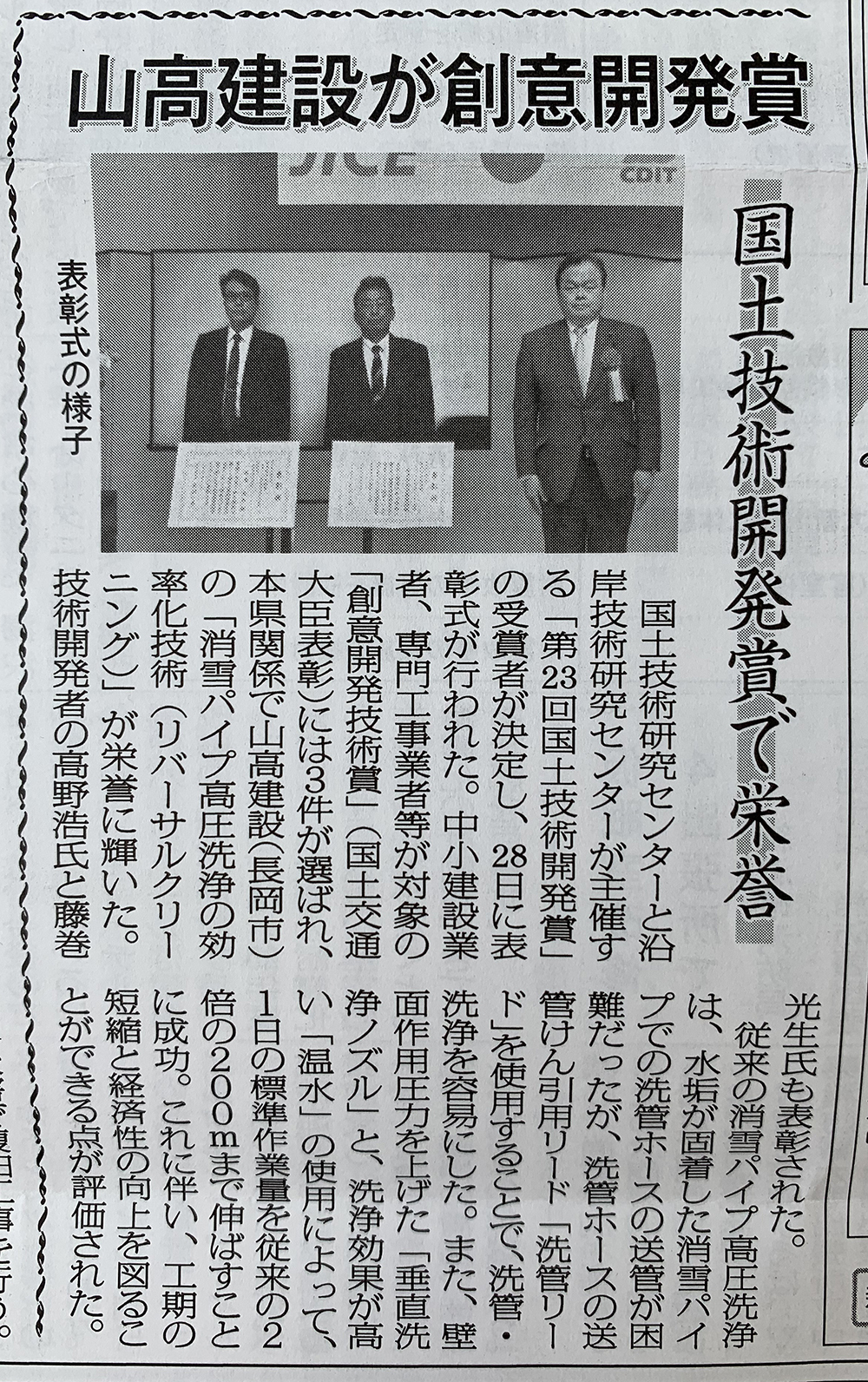 | 令和3年9月 | 消雪パイプ高圧洗浄の効率化技術「リバーサルクリーニング」 第23回国土技術開発賞 創意開発技術賞 (国土交通大臣表彰)受賞 |